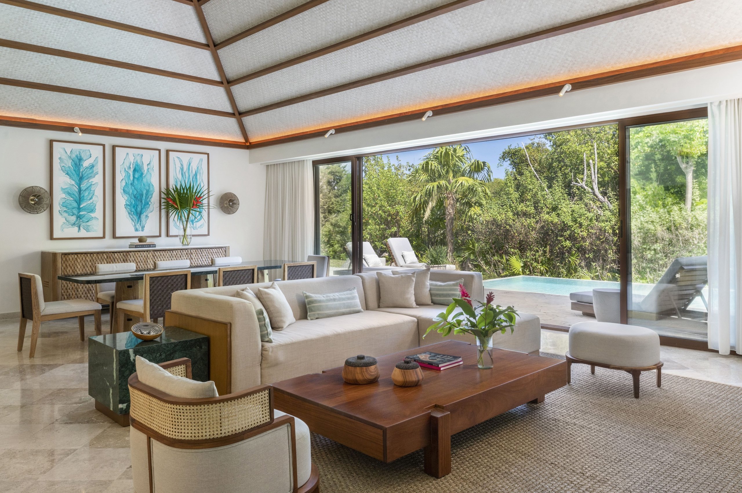 The Bamboo Suite offers a serene retreat in the heart of the Riviera Maya. Soaring ceilings and a spacious living room open to sweeping views of the tropical forest and resort.