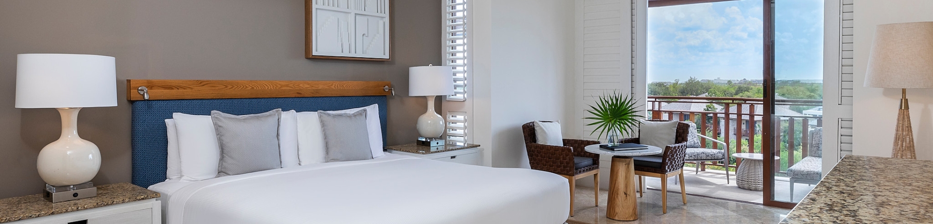 Located in the Bamboo Tower, near the main building and the Bamboo Pool, the Fairmont View Room offers a tranquil escape. Large sliding glass doors open to your private balcony or terrace, complete with a seating area, inviting you to indulge in breathtaking panoramic resort views. Relax and unwind in the spa-inspired bathroom, featuring luxurious marble accents, a deep soaking tub, a double vanity, and a private shower stall for your ultimate rejuvenation after a day of exploration.