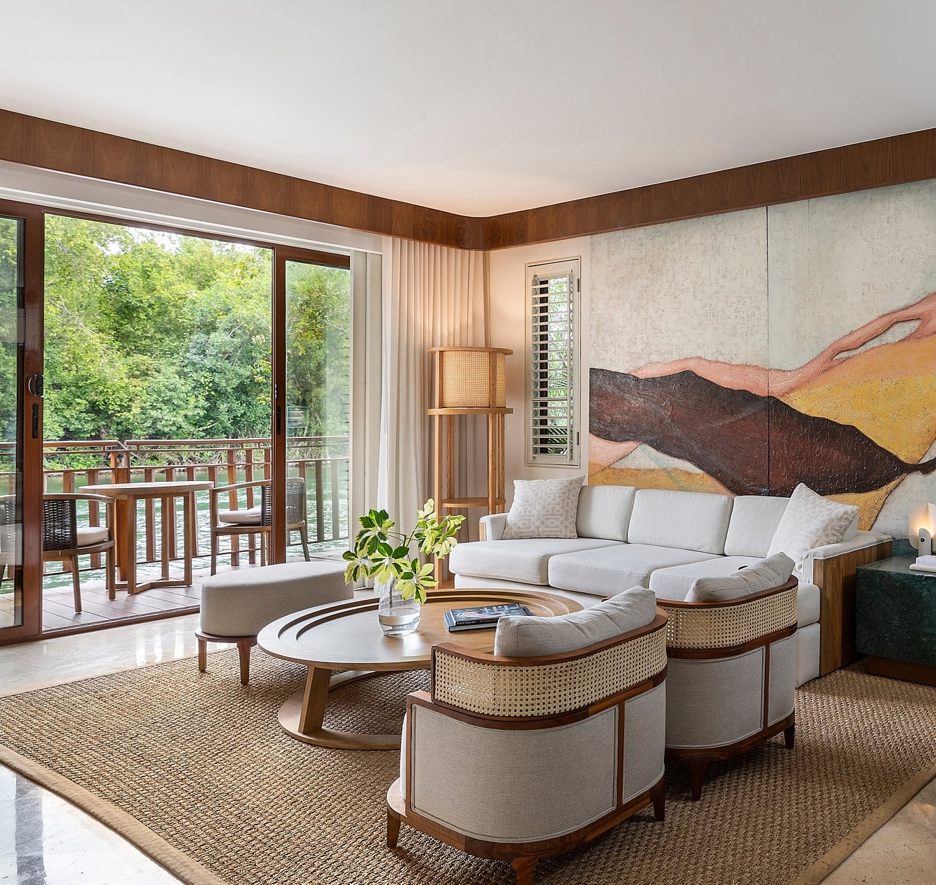 The Bamboo Suite offers a serene retreat in the heart of the Riviera Maya. Soaring ceilings and a spacious living room open to sweeping views of the tropical forest and resort.