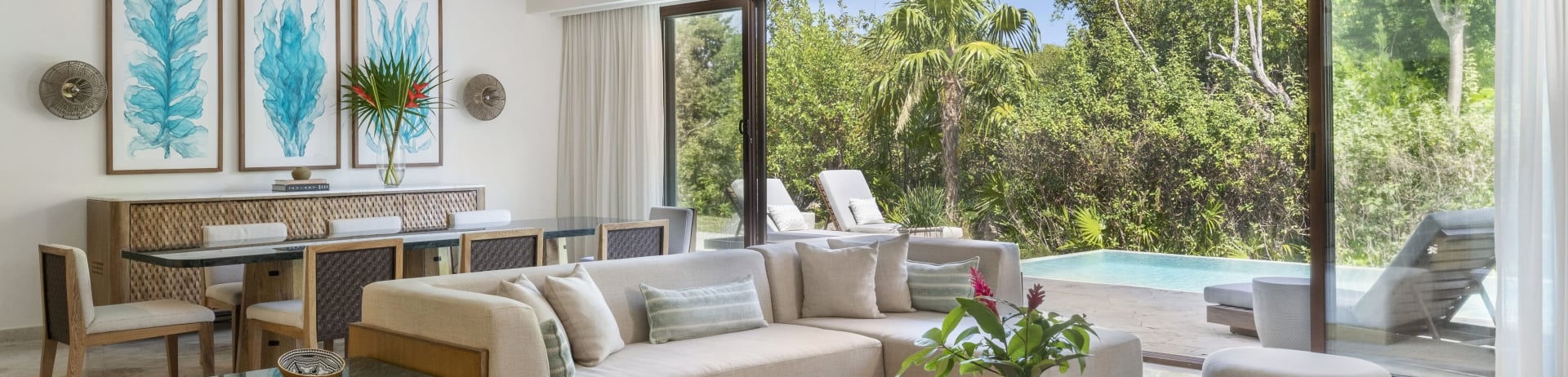 Santuario aislado en la playa, situado en el enclave privado del complejo, con vistas panorámicas a la mar turquesa del Caribe. Piscina infinita privada y terraza amueblada. Amplia sala de estar y comedores independientes. Una cama King. Dos cuartos de baño tipo spa. Servicio exclusivo de mayordomo Fairmont.