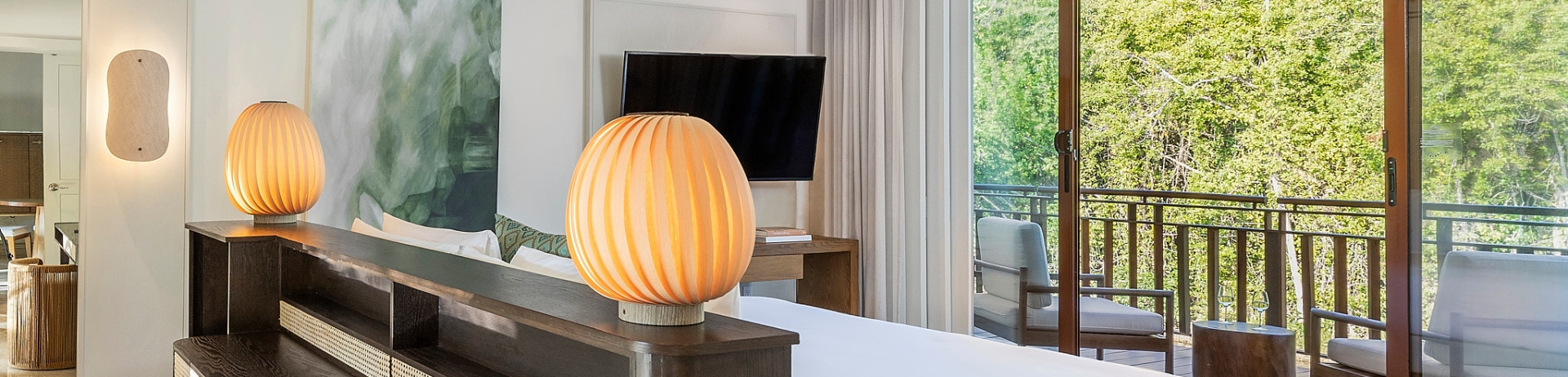 Lujosas suites con techos altos y un balcón envolvente privado con vistas a la selva tropical, la serena laguna o los canales de agua. Elegante dormitorio principal con sala de estar independiente con sofá cama. Dos camas Queen. Baño principal estilo spa con baño adicional.