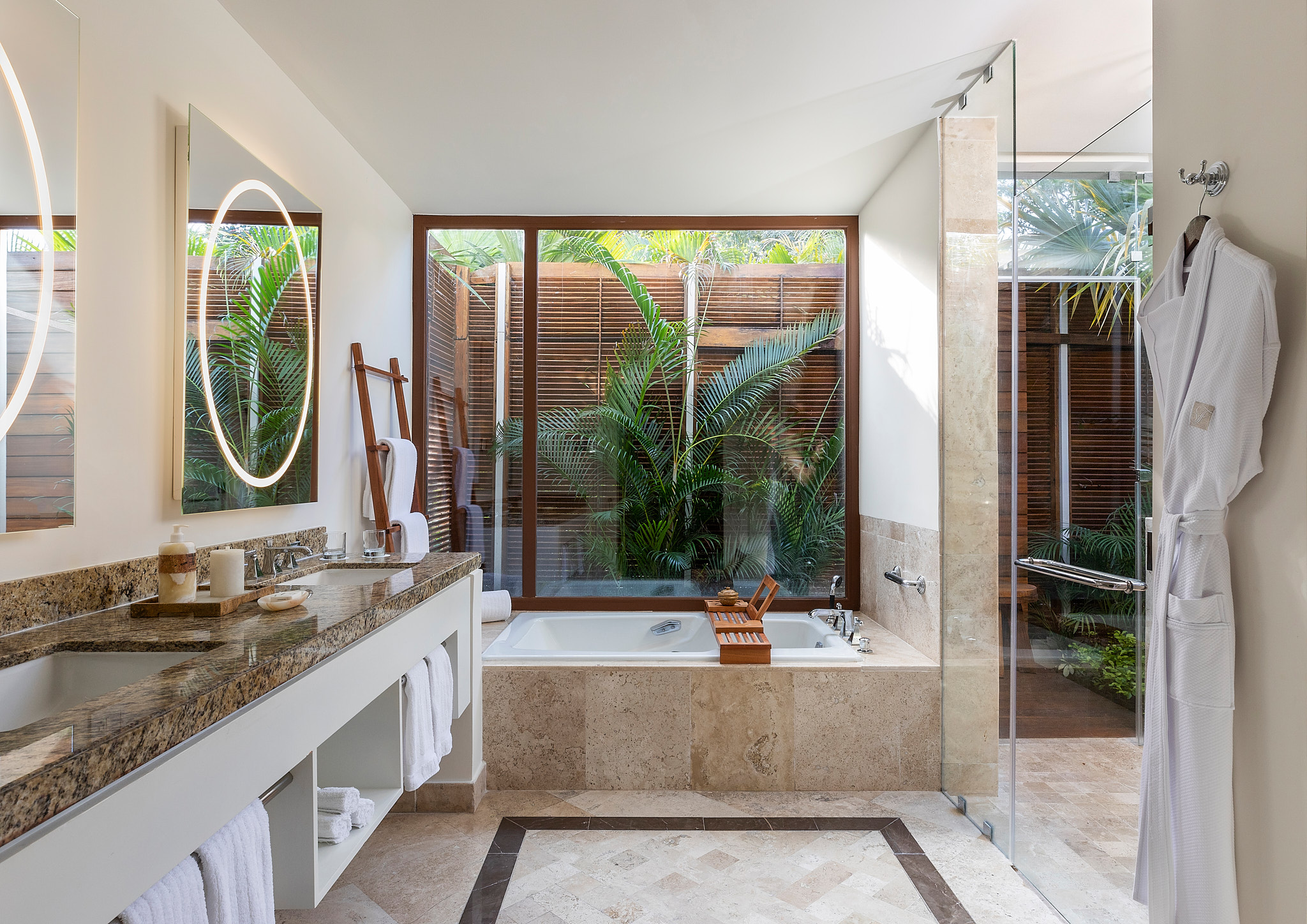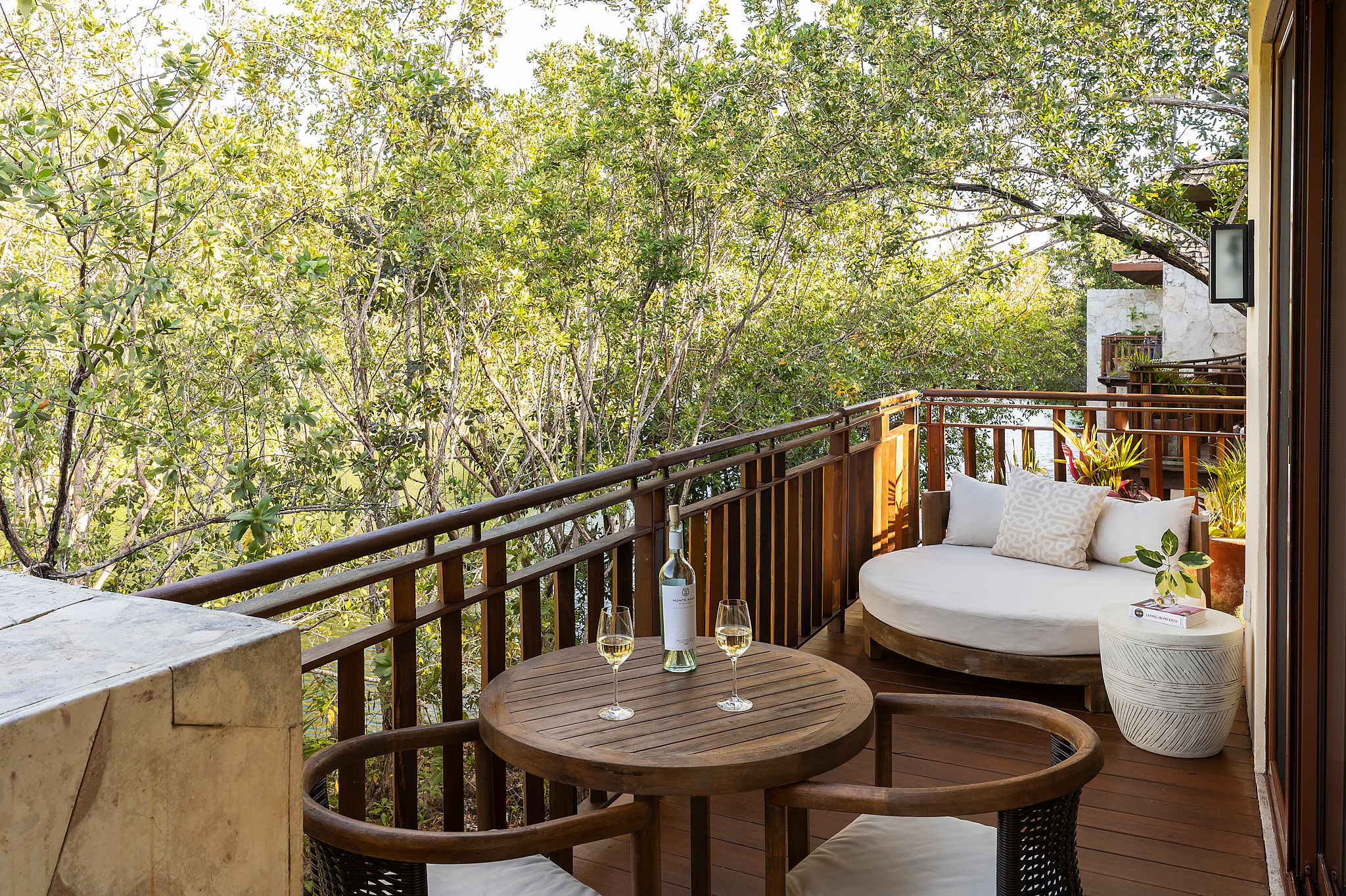 La Beach Area Suite, rodeada por el icónico manglar de Mayakoba, cuenta con balcón envolvente y un entorno sereno que lo sumerge en el encanto de la naturaleza.